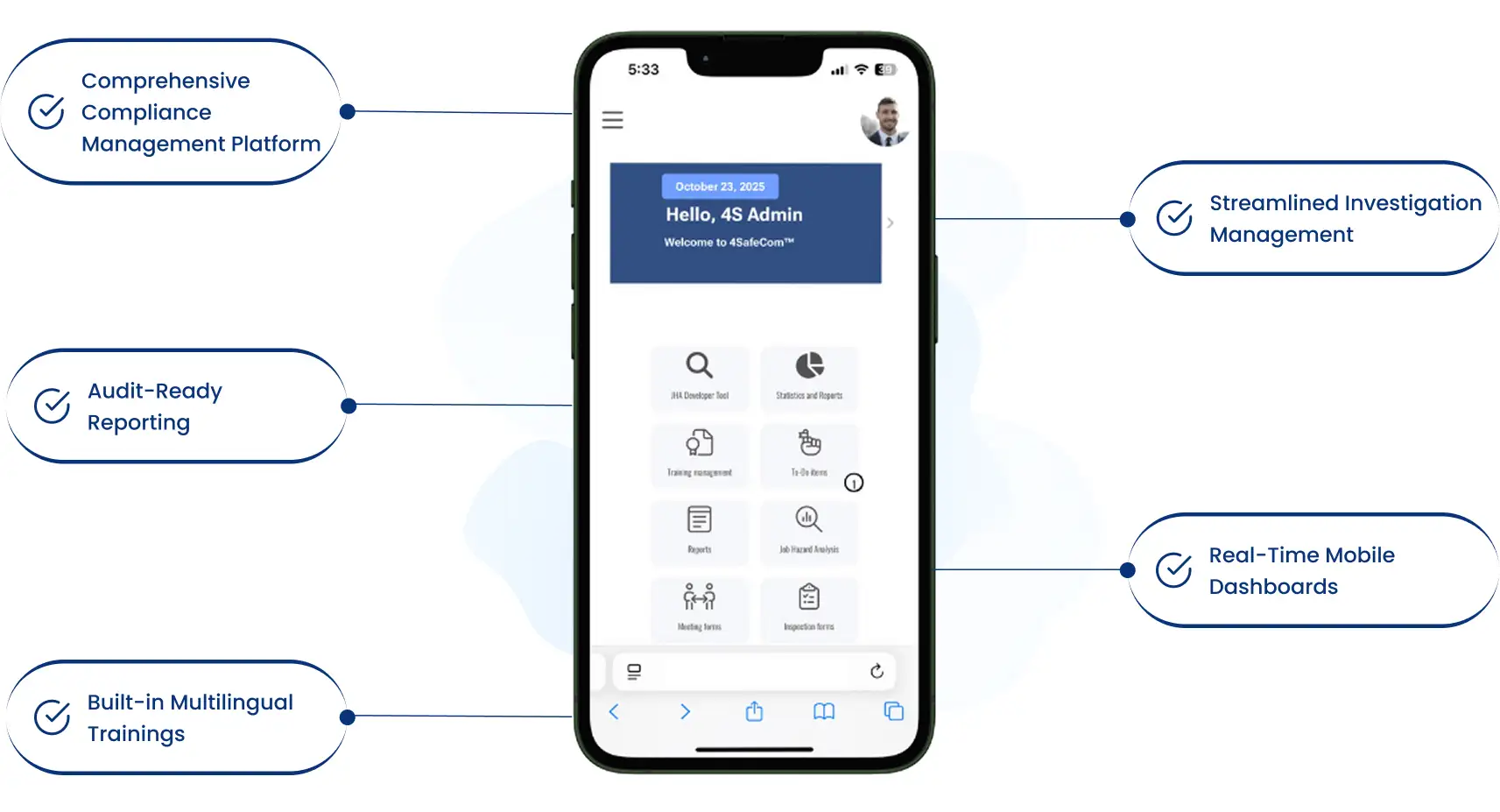 Built for businesses of every size, 4SafeCom™ transforms compliance from a burden into a streamlined process. It enables organizations to sustain safety culture, simplify audits, and reduce costs—delivering long-term value through one integrated safety management platform.